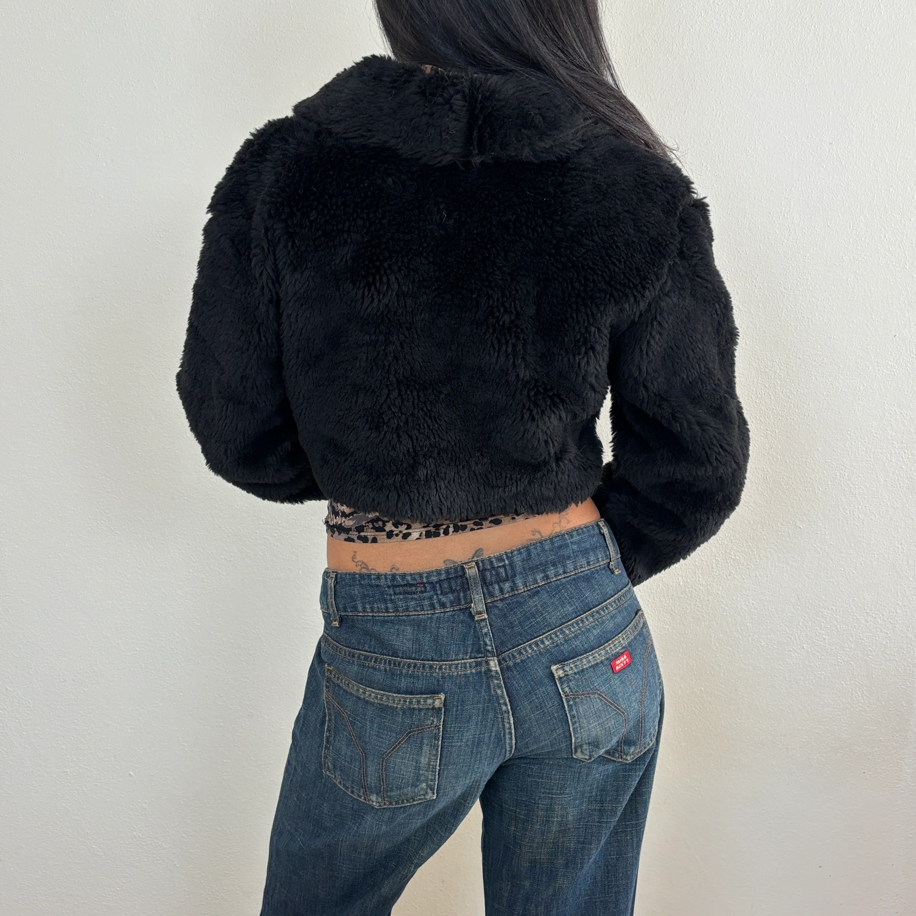 Black cropped faux fur tie up jacket. The perfect piece to add to any outfit. Modelled on a size 6/8. Best fit s/m.