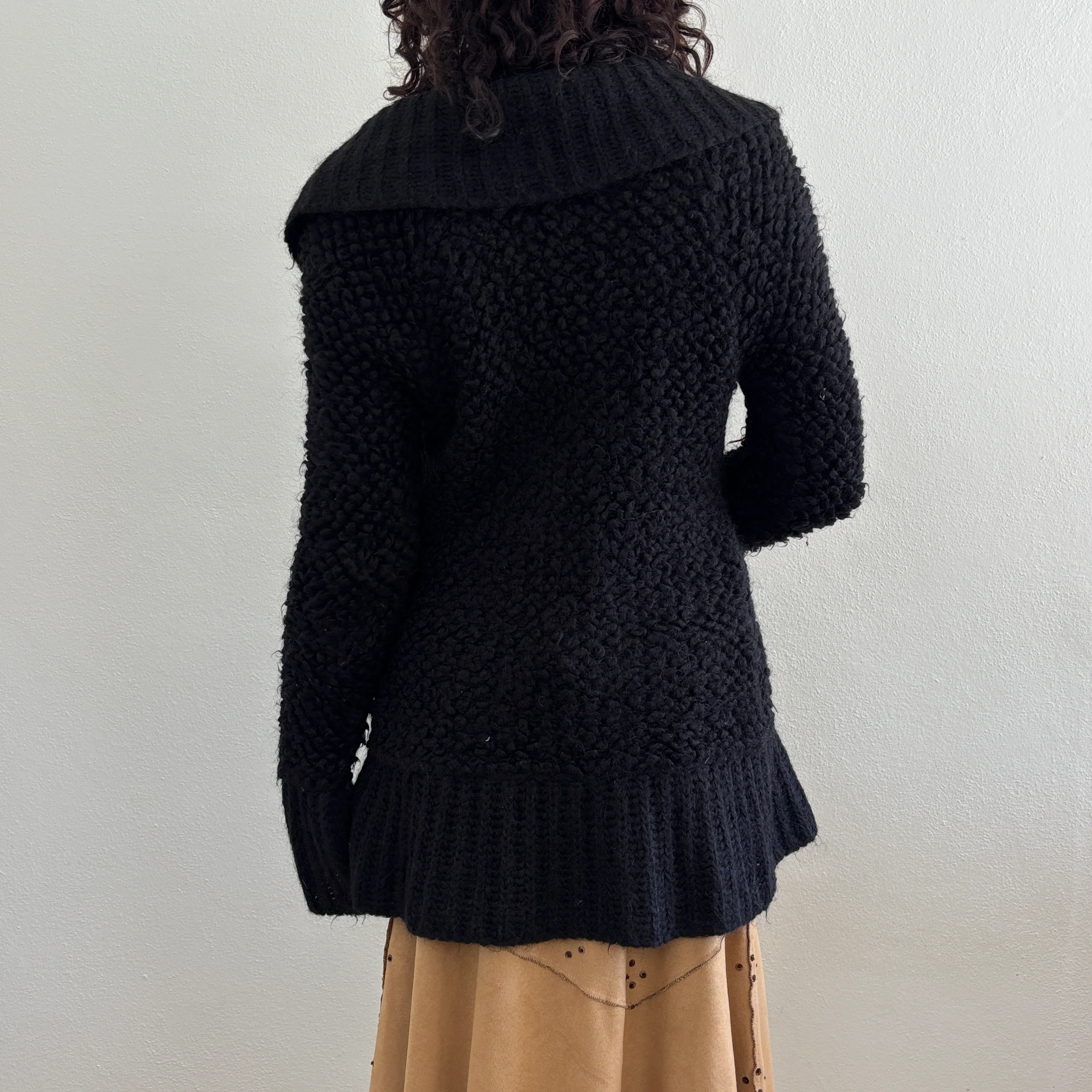 Italian made black ruffle knit cardigan. Fabric composition is Acrylic/Polyamide/Mohair/Wool. Modelled on a size 6. Has a few minor pulls that aren't noticeable when worn.