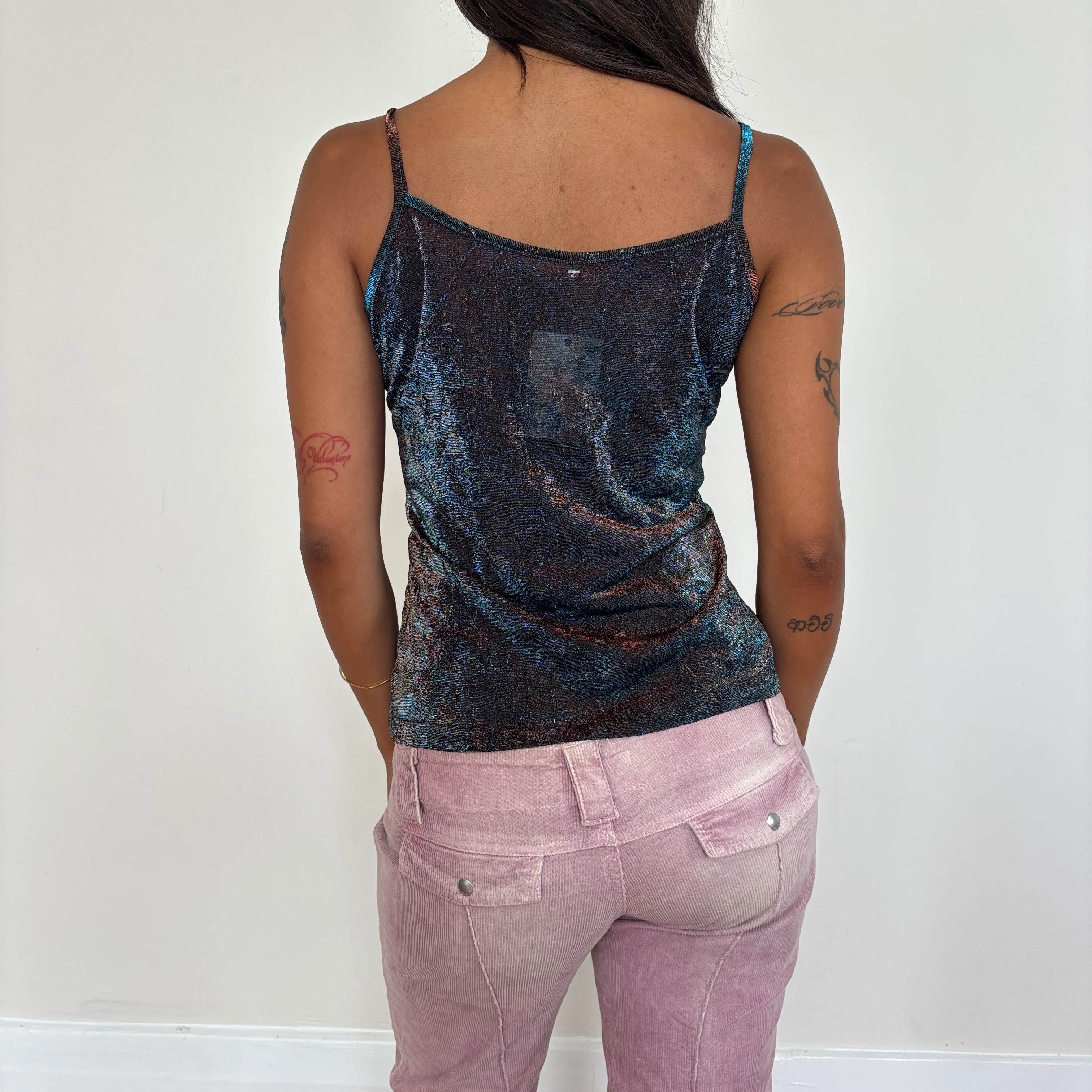 Blue and brown toned sparkly metallic mesh cami. Modelled on a 6/8, pinned back slightly. Sourced from Italy.