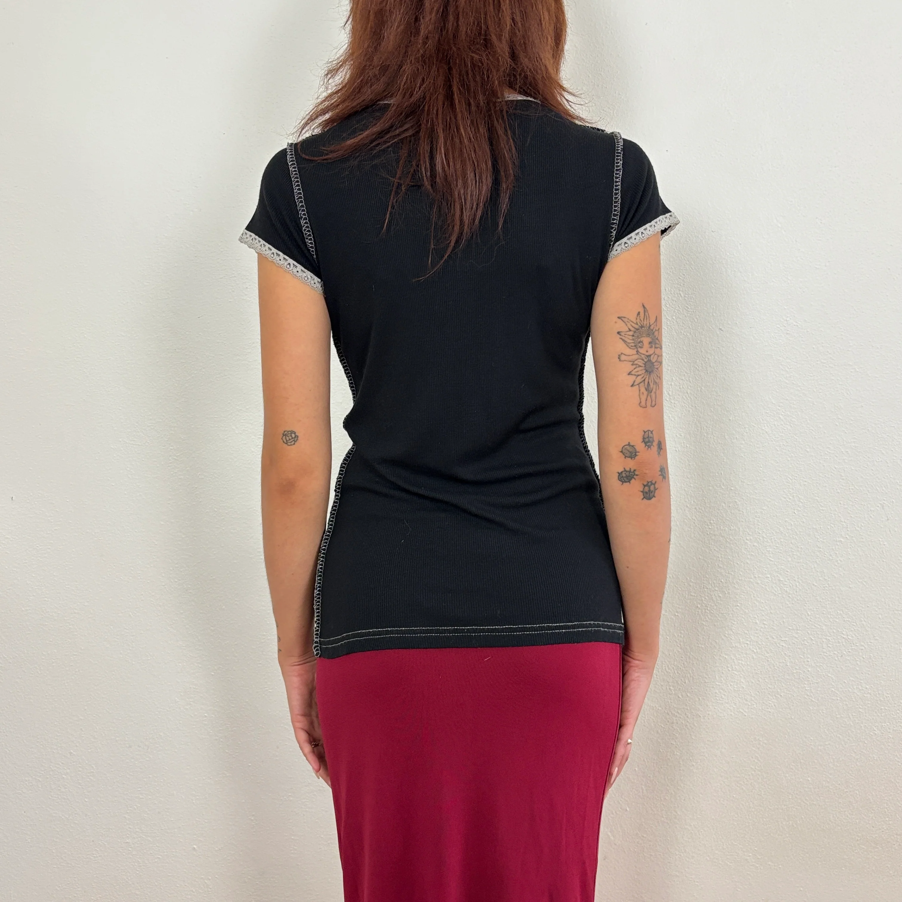 Adorable black ribbed top, super flattering with cream detailing. Modelled on a size 6 pinned back. Super stretchy! Can fit M or L due to stretch or S for a slightly looser fit. Sourced from Italy.