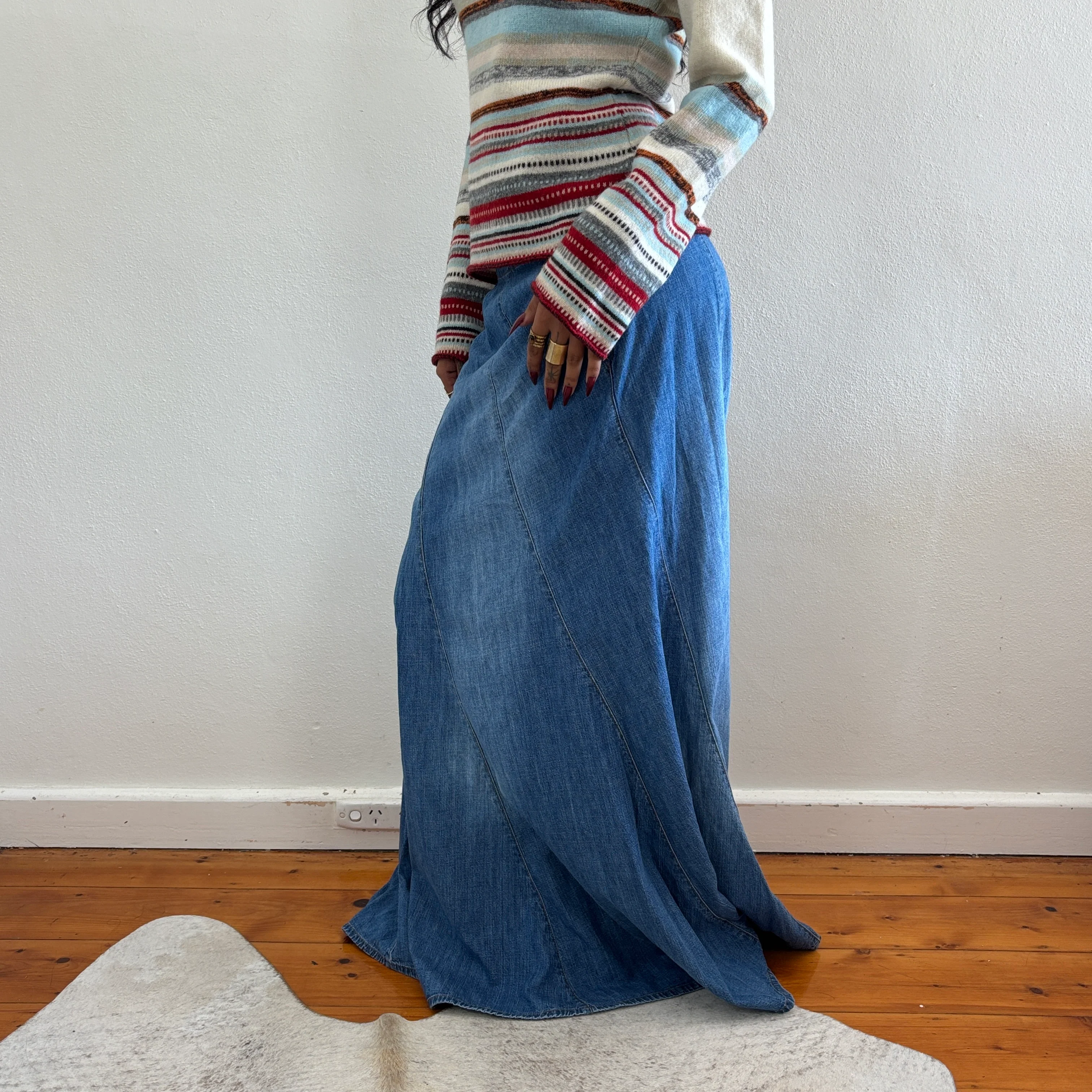 denim flowy maxi skirt zip on side, waist 15”, length 40.5”. Modelled on a 6/8,162cm tall. Sourced from Italy.
