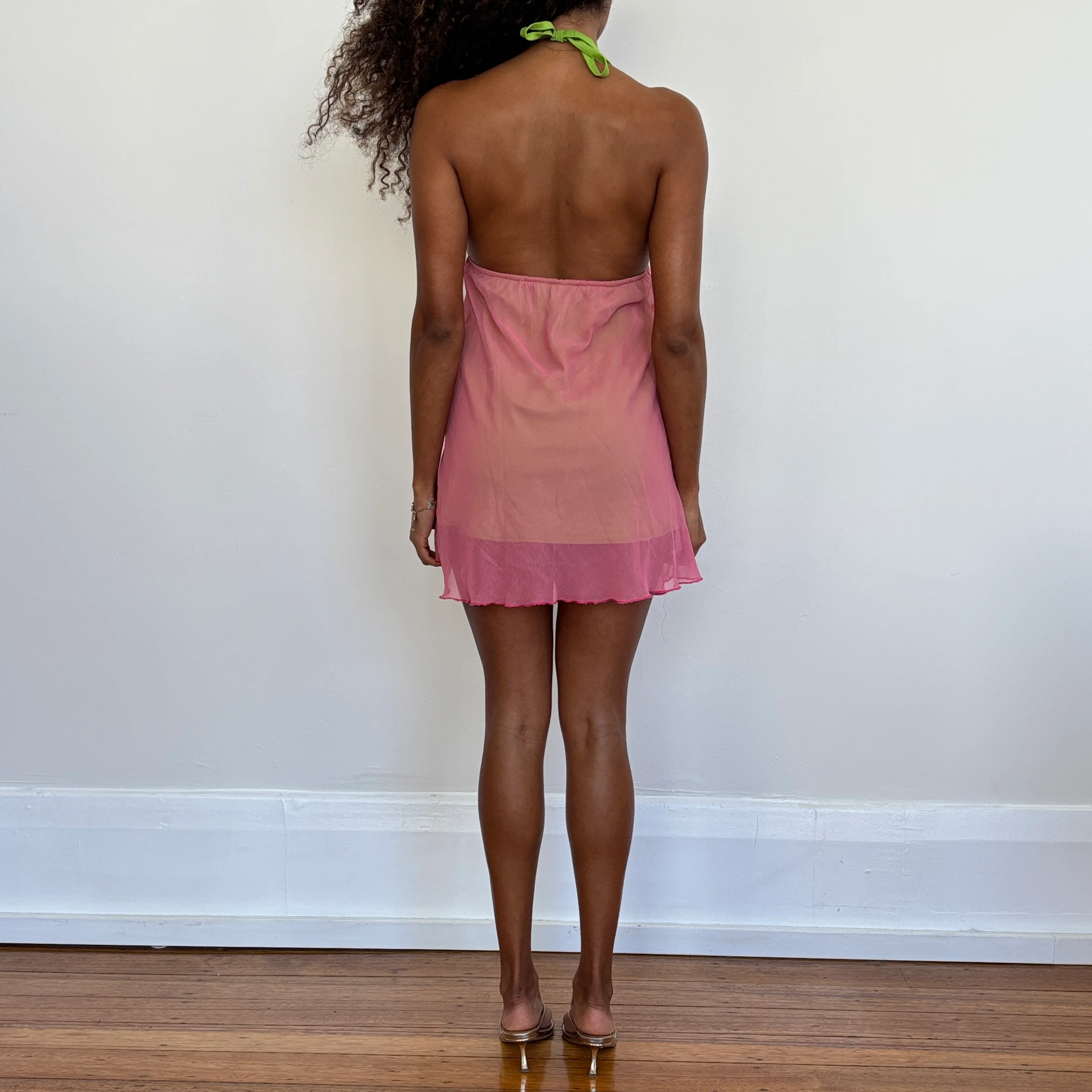 Adorable summery overlay pink mini dress with halter neck. Brand is 'Cliche' Modelled on a 6/8 pinned back slightly. Sourced from Italy.