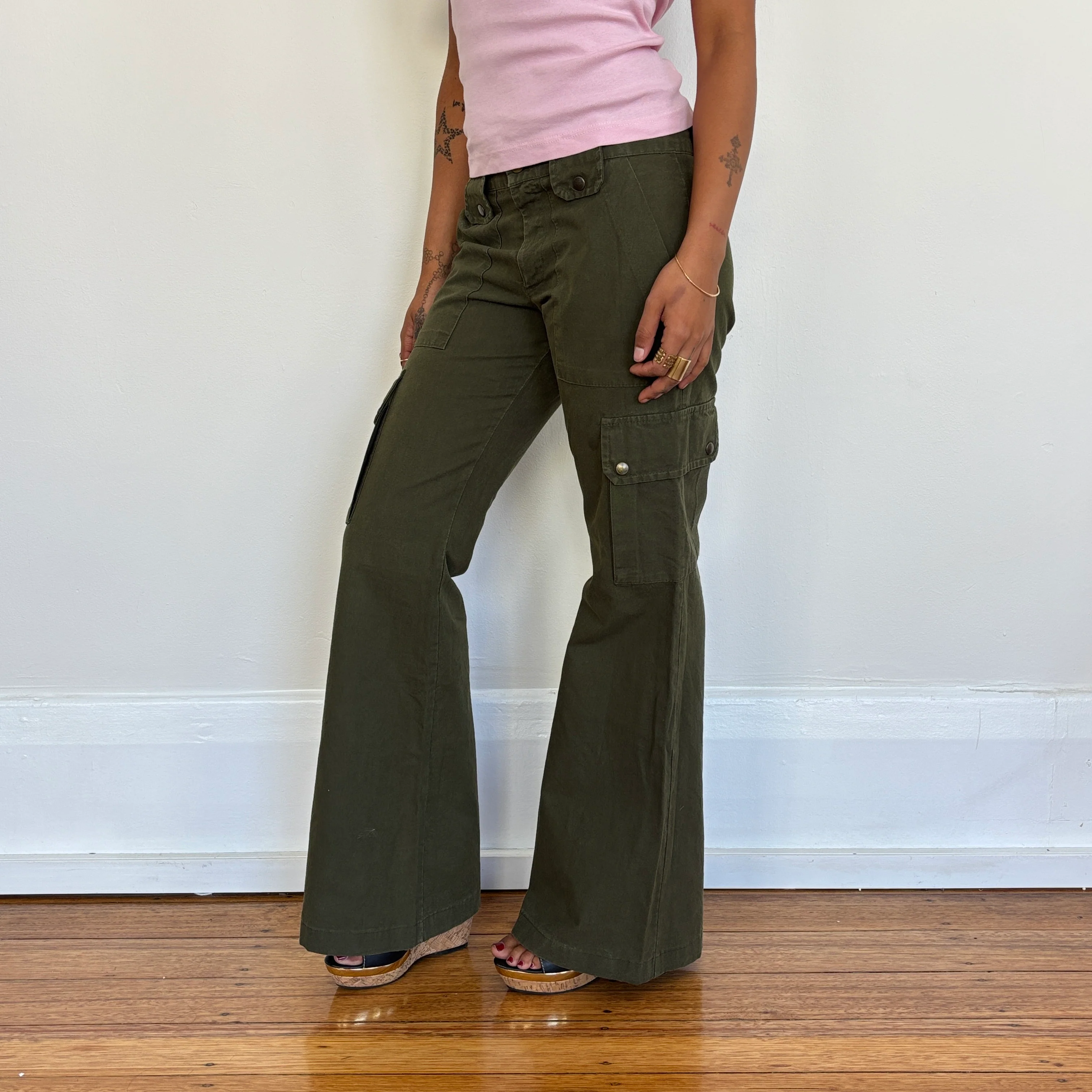 Khaki lowrise flared pants. Sourced from Italy. Modelled on a 6/8.