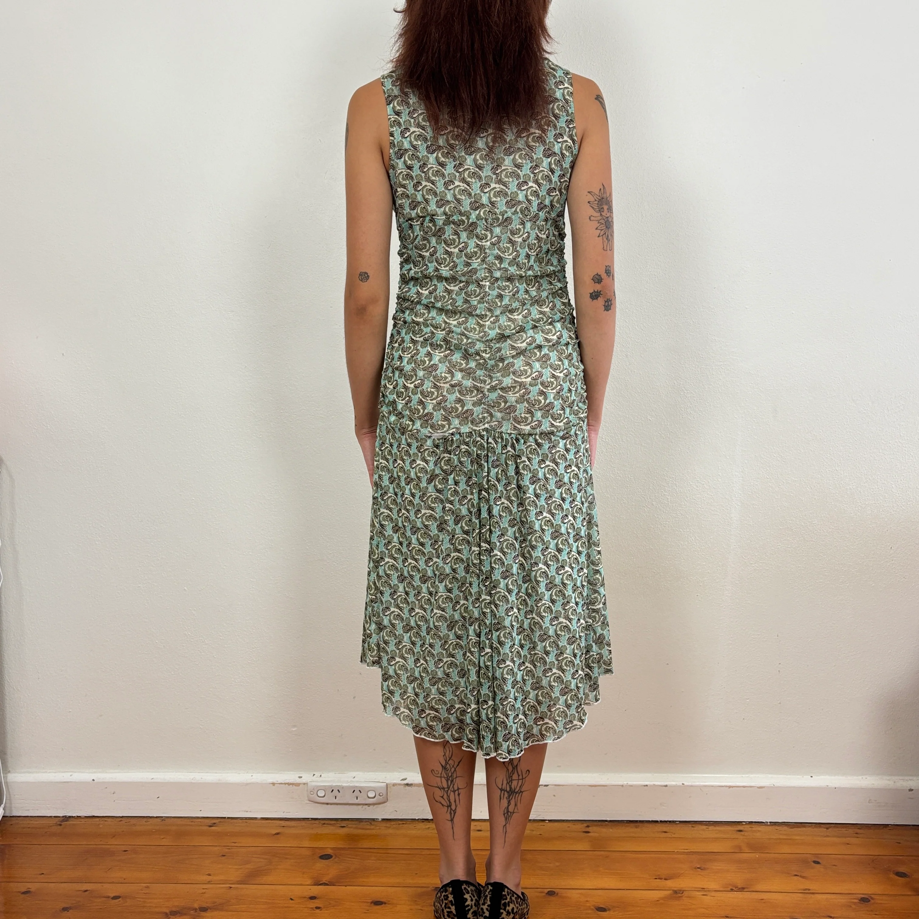 Beautiful ruched graphic print mesh midi dress. Modelled on a size 6 pinned back slightly. Sourced from Italy. Stretchy.