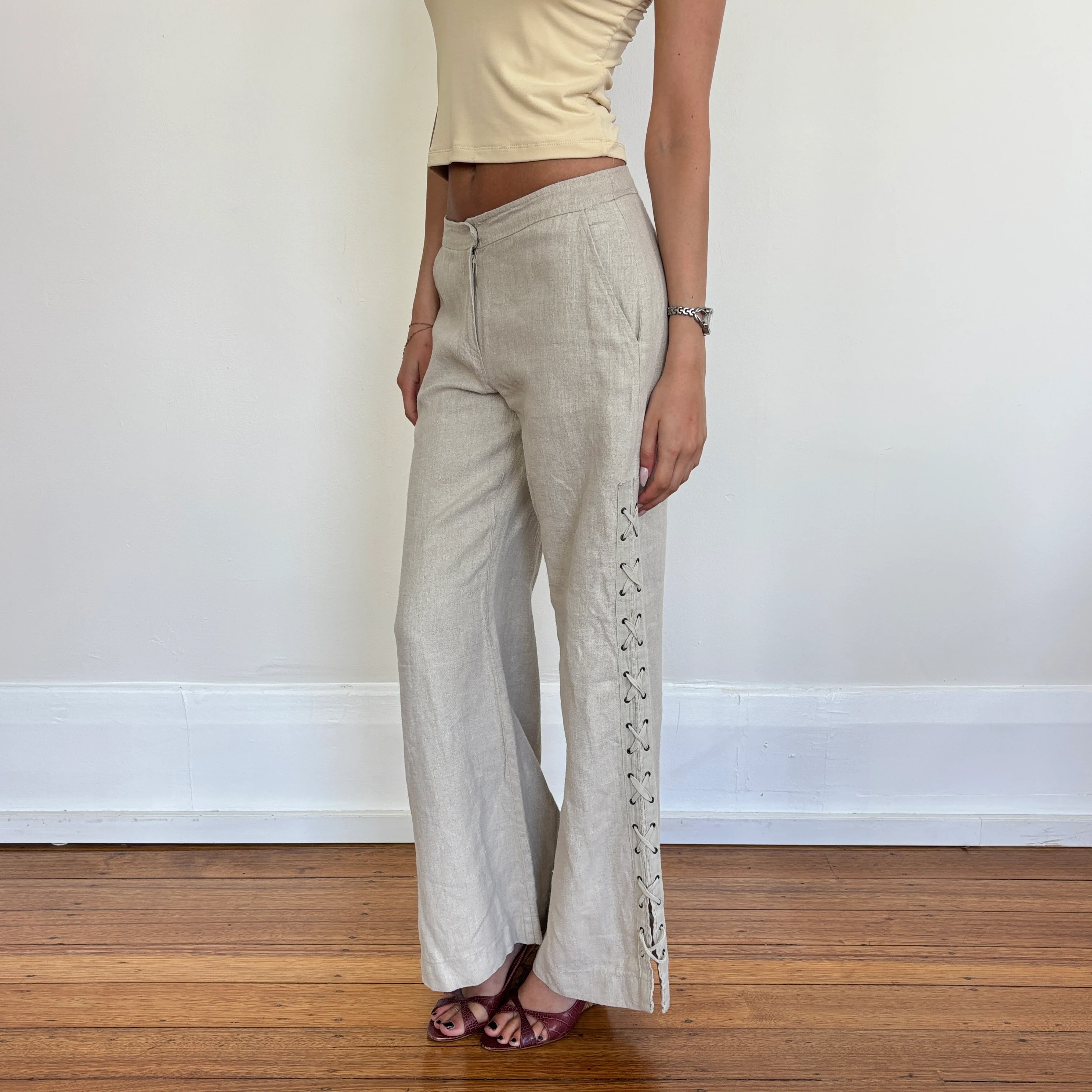'Motivi' Italian made linen lace up detail low rise pants.